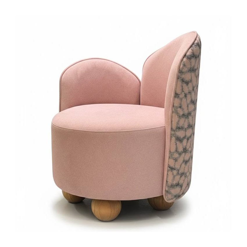 Кресло, которое невозможно не заметить. Мягкая округлая форма, пастельный розовый велюр и фактурная ткань с абстрактным узором Baumann на внешней стороне спинки — каждая деталь продумана до мелочей. Спинка с двумя изящными лепестками придаёт силуэту игривость и лёгкость, а шарообразные ножки из натурального дерева завершают образ.