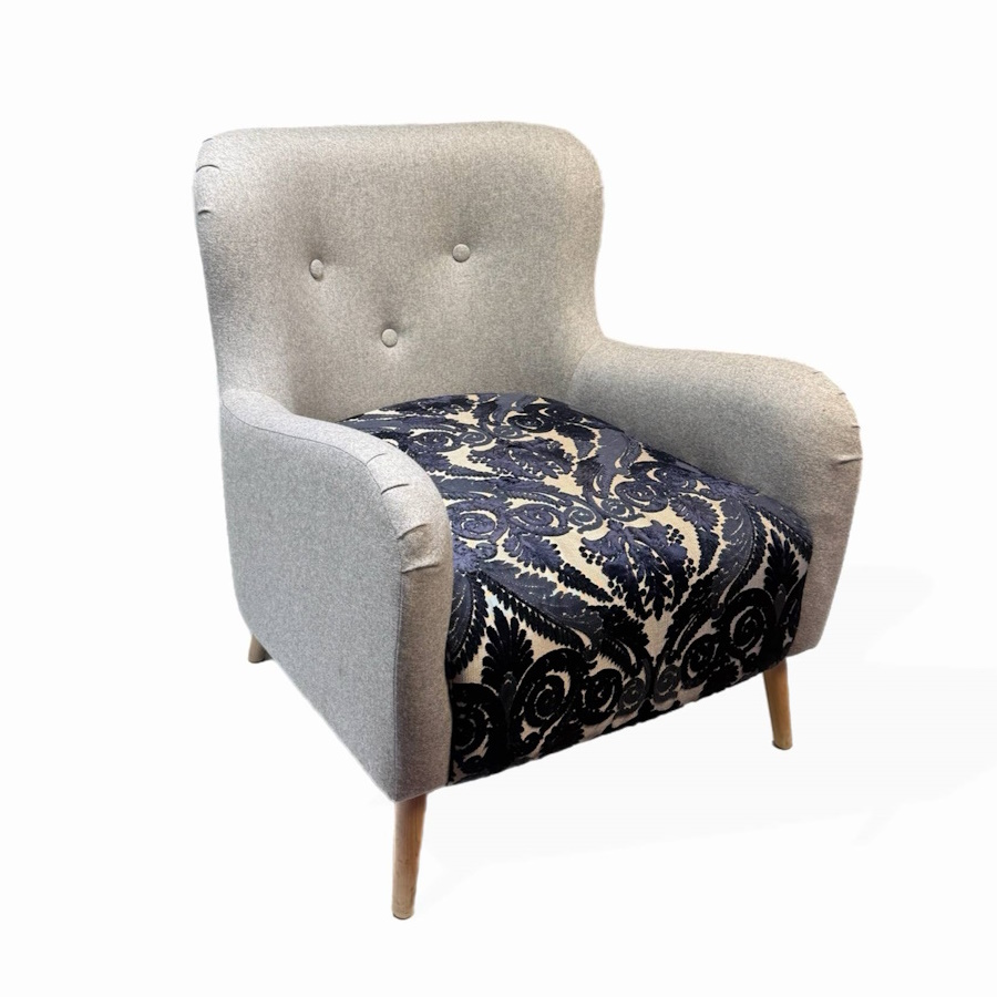 Просторное кресло для тех, кто любит комфорт и не боится ярких решений. Лаконичный серый шерстяной корпус с каретной стяжкой на спинке контрастирует с роскошным сиденьем из бархатистой ткани с тёмно-синим дамасским узором — классика в современном прочтении. Широкие мягкие подлокотники и глубокое сиденье делают его по-настоящему уютным. Тонкие ножки из натурального дерева добавляют лёгкости.