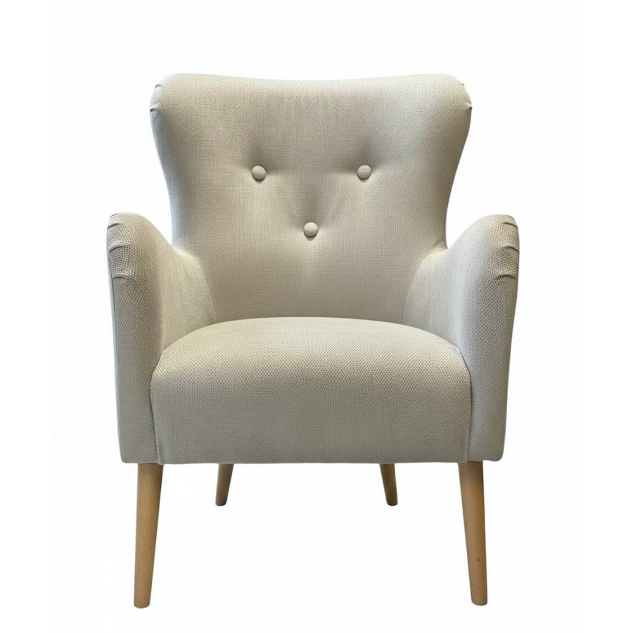 Классическое кресло с высокой спинкой и мягкими подлокотниками — такое, в котором хочется провести весь вечер с книгой или чашкой чая. Спинка украшена элегантной каретной стяжкой, а однотонная обивка в тёплом молочном оттенке создаёт ощущение лёгкости и уюта. Тонкие ножки из натурального дерева придают силуэту лёгкость в скандинавском духе.