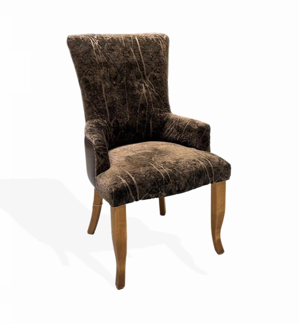 Элегантное кресло на изогнутых ножках из массива бука. Комбинированная обивка: лицевая сторона — бархатистая ткань с живописным мраморным рисунком, внешняя сторона спинки и подлокотники — натуральная кожа с эффектом старения. Края оформлены декоративными металлическими заклёпками. Сочетание фактур делает кресло выразительным акцентом в интерьере гостиной, спальни или домашнего кабинета.