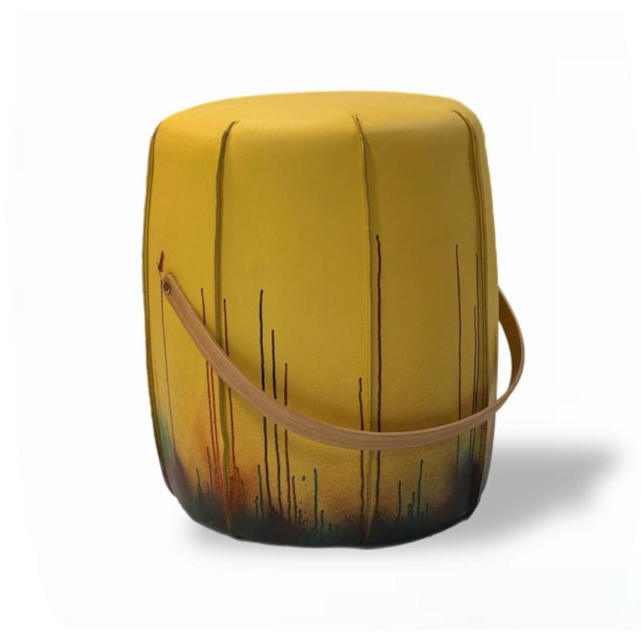 Этот пуф — не просто предмет мебели, а готовый арт-объект. Охристо-жёлтая экокожа с авторским рисунком напоминает абстрактную живопись: тёмные вертикальные штрихи и цветовые переходы от янтарного к глубокому зелёно-чёрному у основания создают ощущение живого, рукотворного произведения.