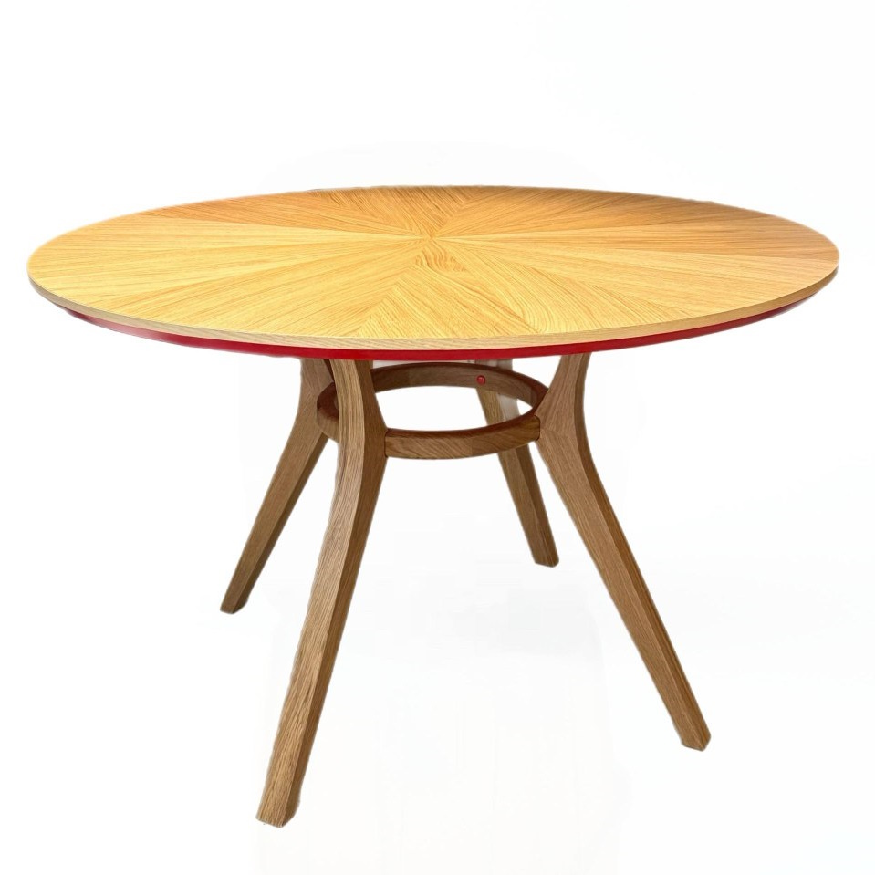 Круглый обеденный стол на четырёх изогнутых ножках из массива дуба. Столешница диаметром 120 см отделана шпоном дуба с солнечным рисунком, торец акцентирован красным цветом. Лаконичный дизайн в скандинавском стиле впишется в любой интерьер.