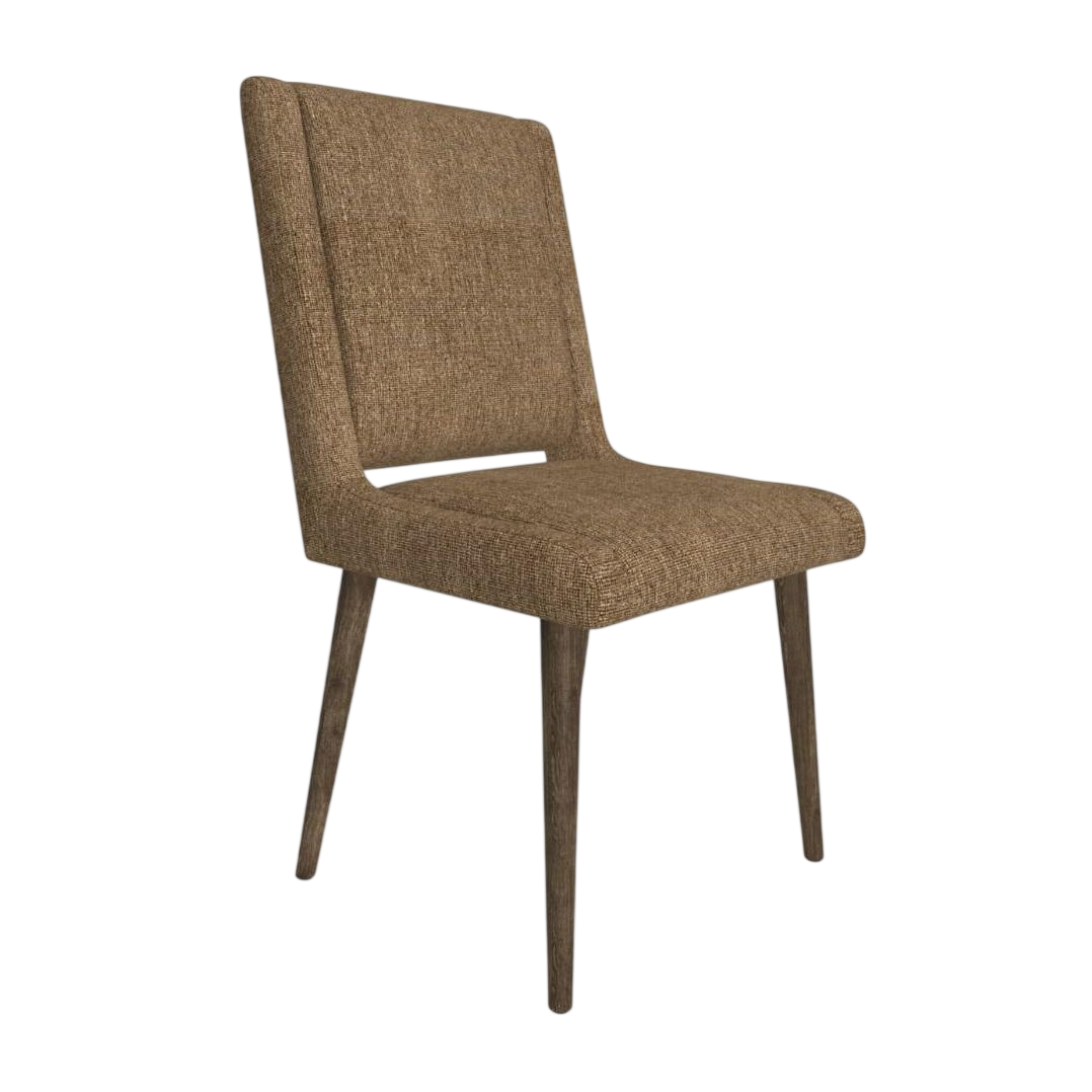 Высокая спинка с аккуратным вырезом у основания, точёные ножки из массива бука и фактурная рогожка в тёплом табачном оттенке — классика, переосмысленная в духе середины прошлого века. Одинаково уместен за обеденным столом и в рабочем кабинете.