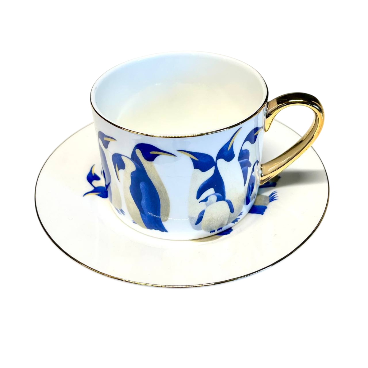 Фарфоровая чашка с блюдцем с авторским принтом императорских пингвинов в сине-белой гамме. Золотой ободок и зеркальная ручка придают паре праздничный, коллекционный вид.