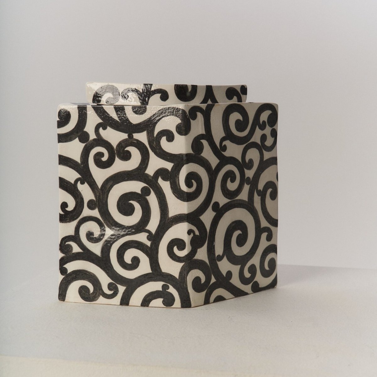 Банка с крышкой "Ромб с узорами" из глины ручной лепки с орнаментом, ангоб, бесцветная глазурь. Внутри белая глазурь.