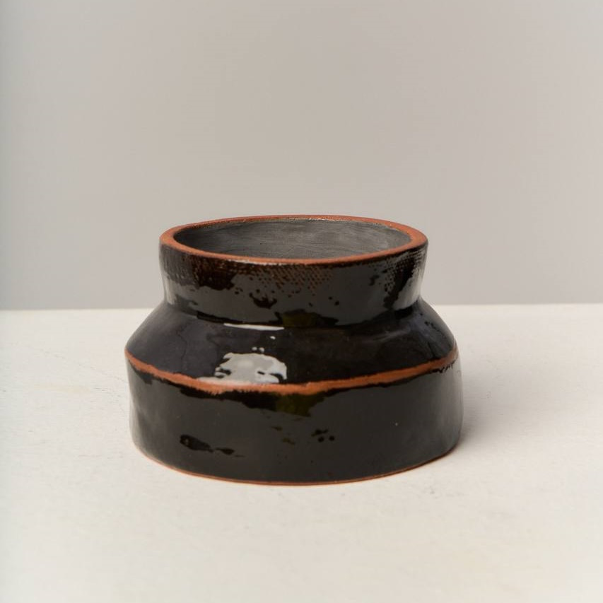 Черная банка ручной лепки выполнена из красной глины с черной глазурью.