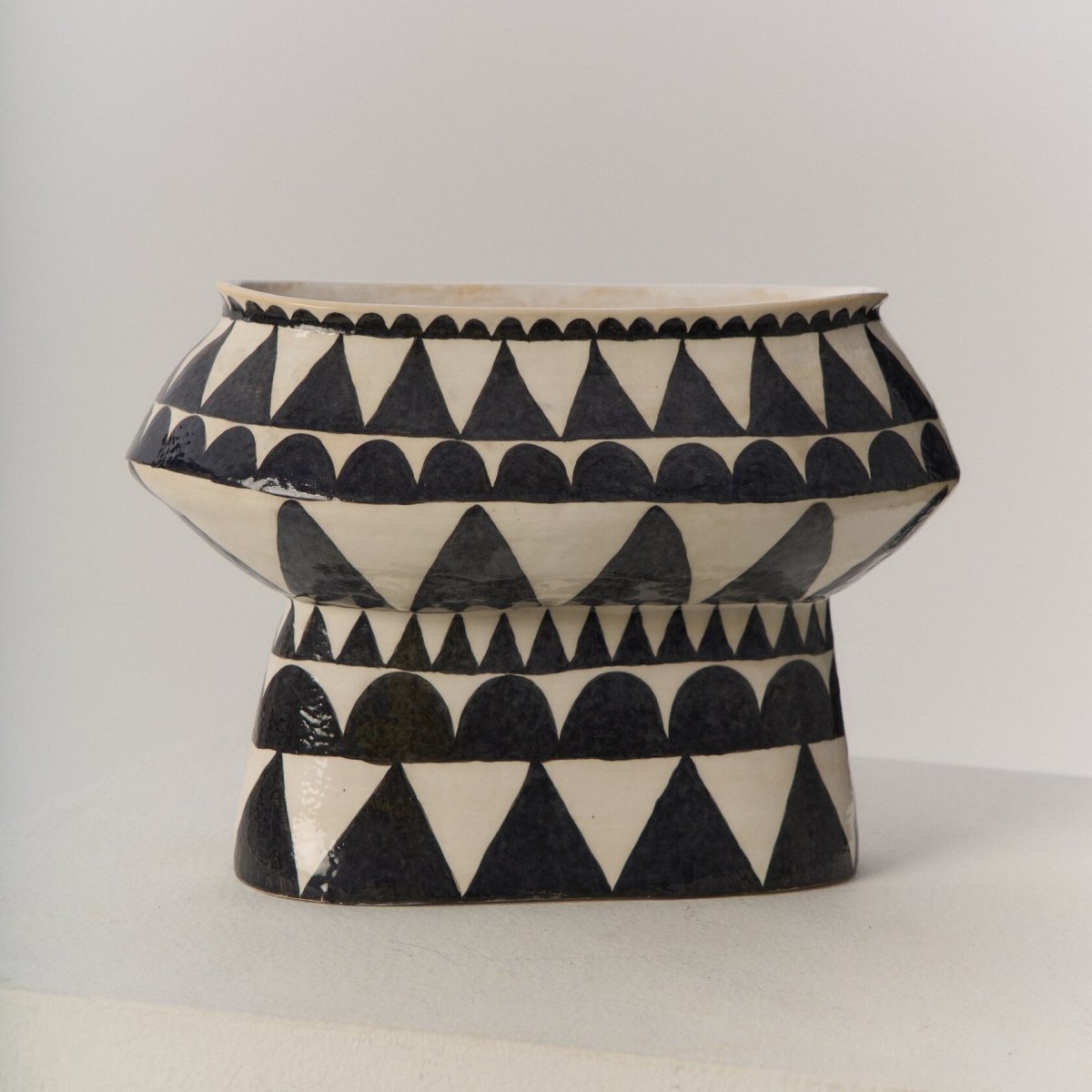 Оригинальная ладья из глины ручной лепки с орнаментом, ангоб, бесцветная глазурь.