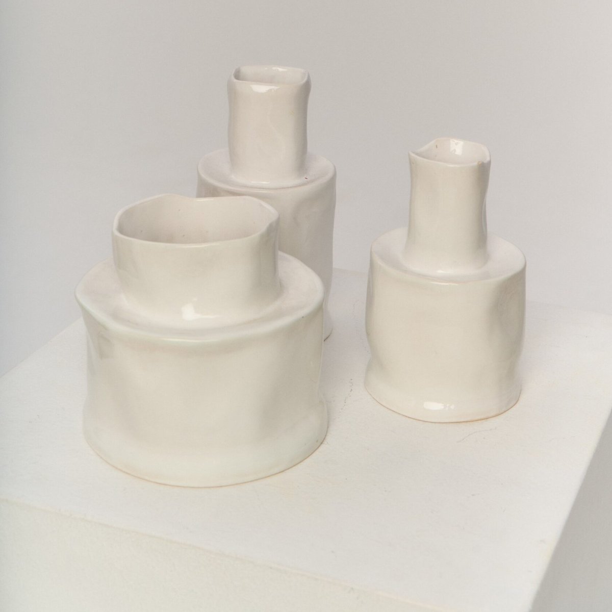 Сет из трех белых ваз ручной лепки выполнен из керамики, сверху и внутри белая глазурь.