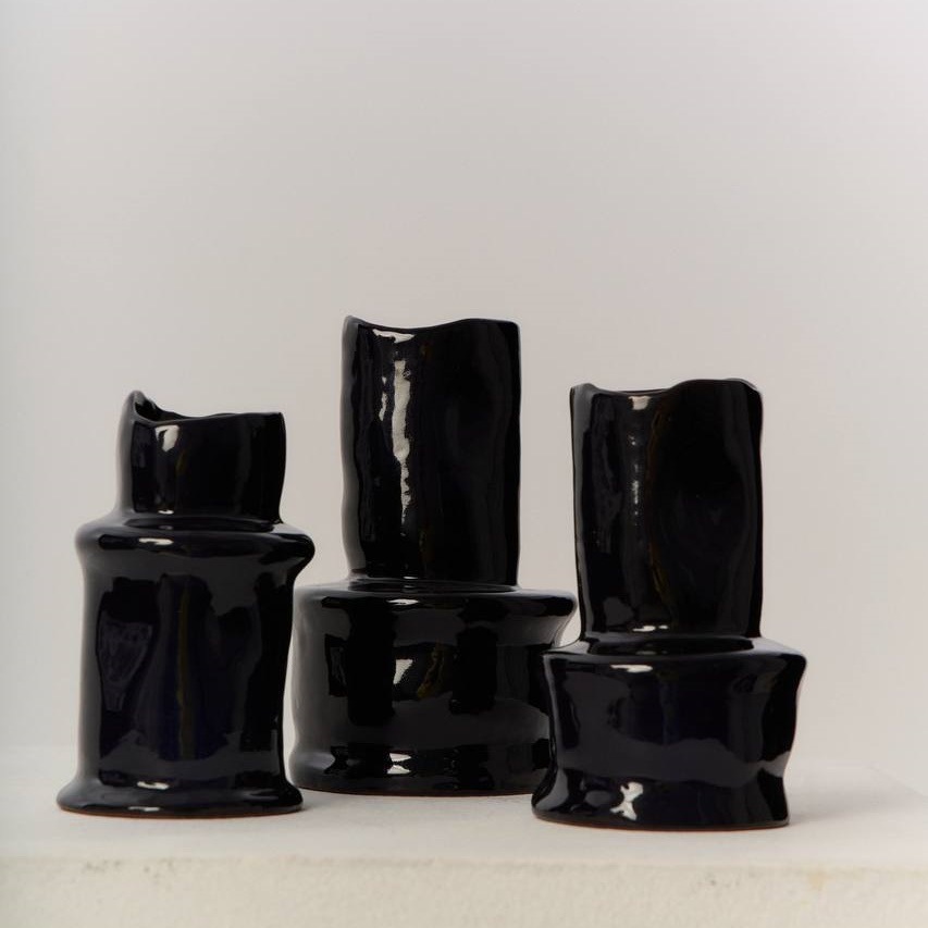 Сет из трех черных кривых глянцевых ваз ручной лепки выполнен из керамики, сверху и внутри черная глазурь.
