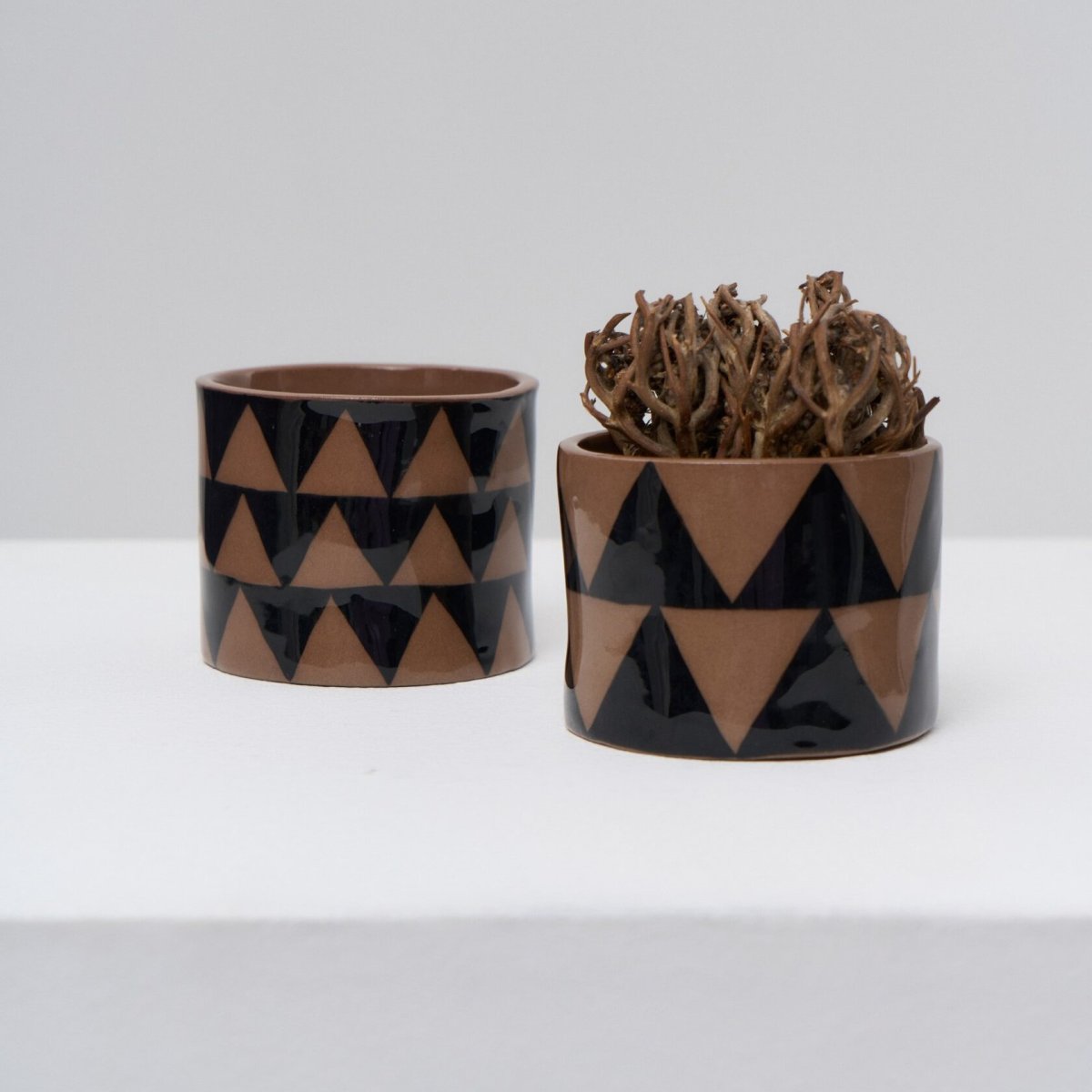 Набор из двух круглых ваз ручной лепки выполнен из темной глины Селадон, роспись, бесцветная глазурь.