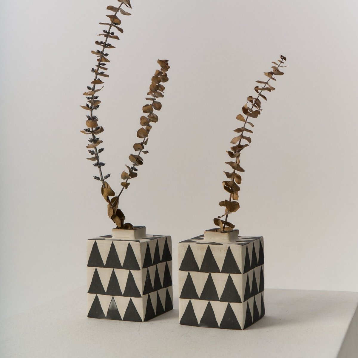 Сет из двух квадратных банок с крышкой ручной лепки выполнен из высокотемпературной глины и ангоб без глазури. Водостойкие.