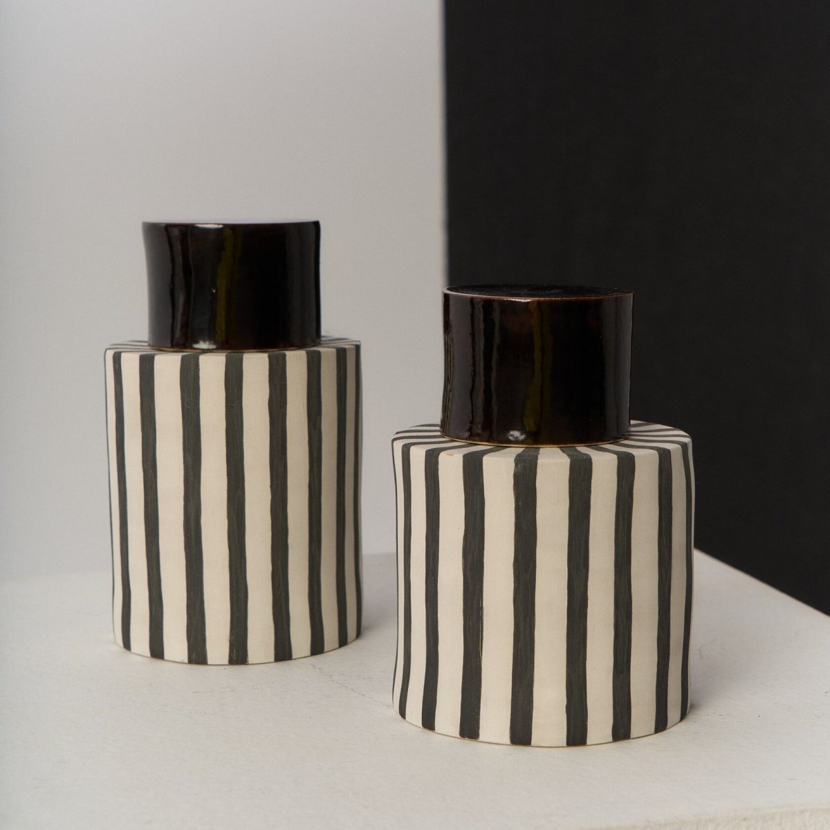 Сет из двух цилиндрических банок с крышкой ручной лепки выполнен из высокотемпературной глины и ангоб без глазури. Крышки покрыты черной глазурью. Водостойкие.