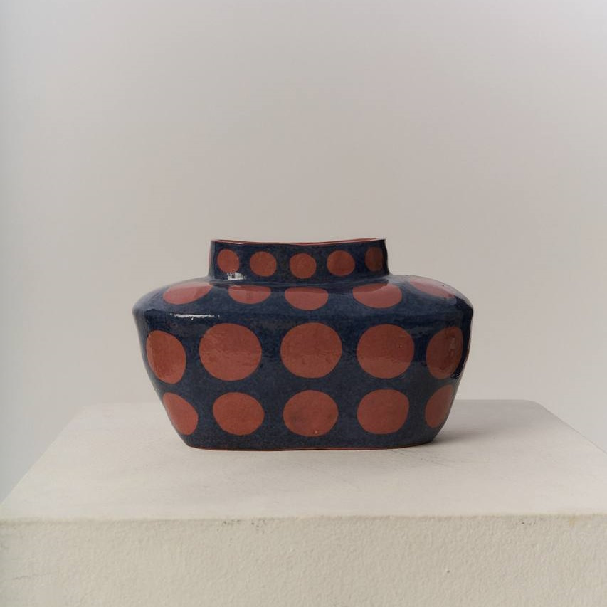Ваза пузатая "Круги" ручной работы из красной глины, ангоб. Бесцветная глазурь.